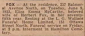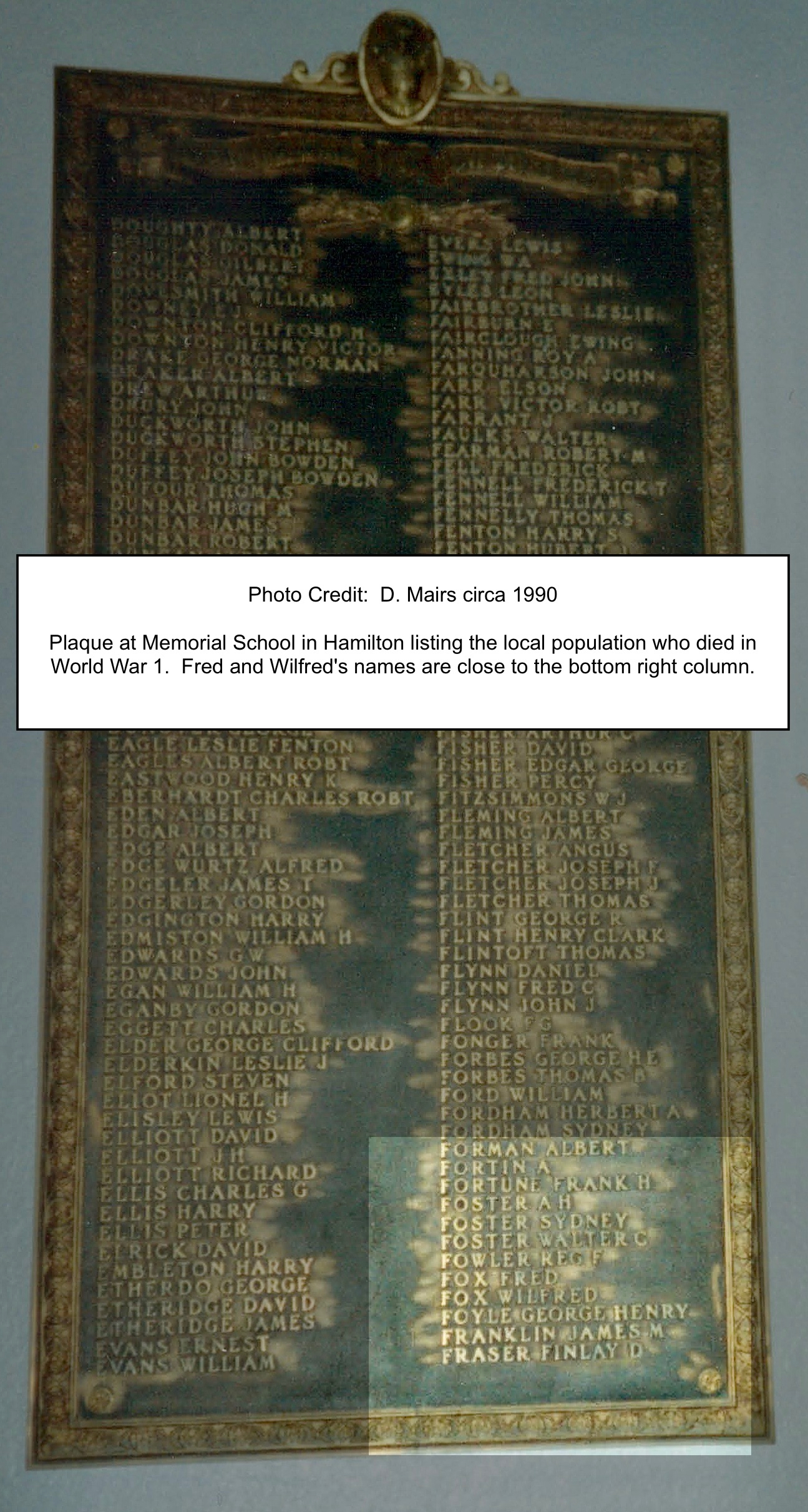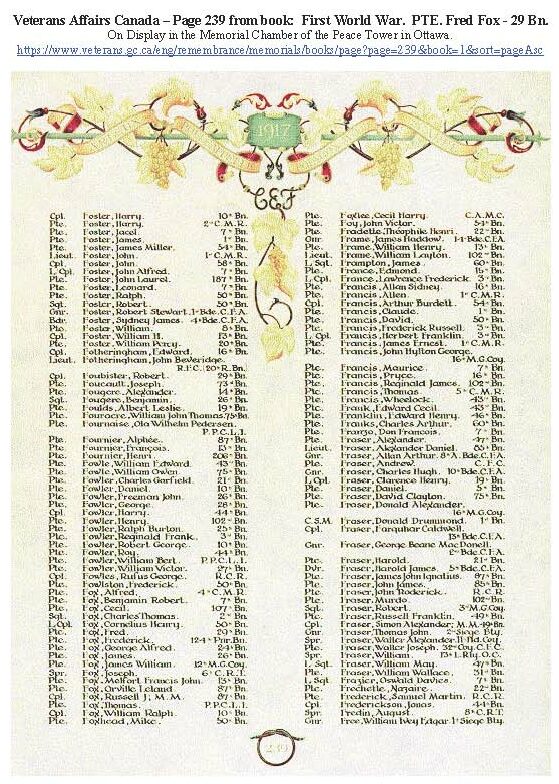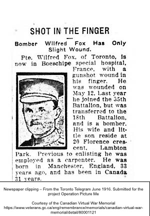 Pte. Fox was born in this city and was 19 years of age. He resided with his brother, Herbert Fox, 228 Gibson Avenue, before his enlistment and was engaged in the munitions department of Westinghouse. His brother, Pte. Wilfred Fox, who enlisted with a Toronto battalion, has been wounded twice and has again returned to the firing line. Surviving are the parents, seven brothers and one sister.