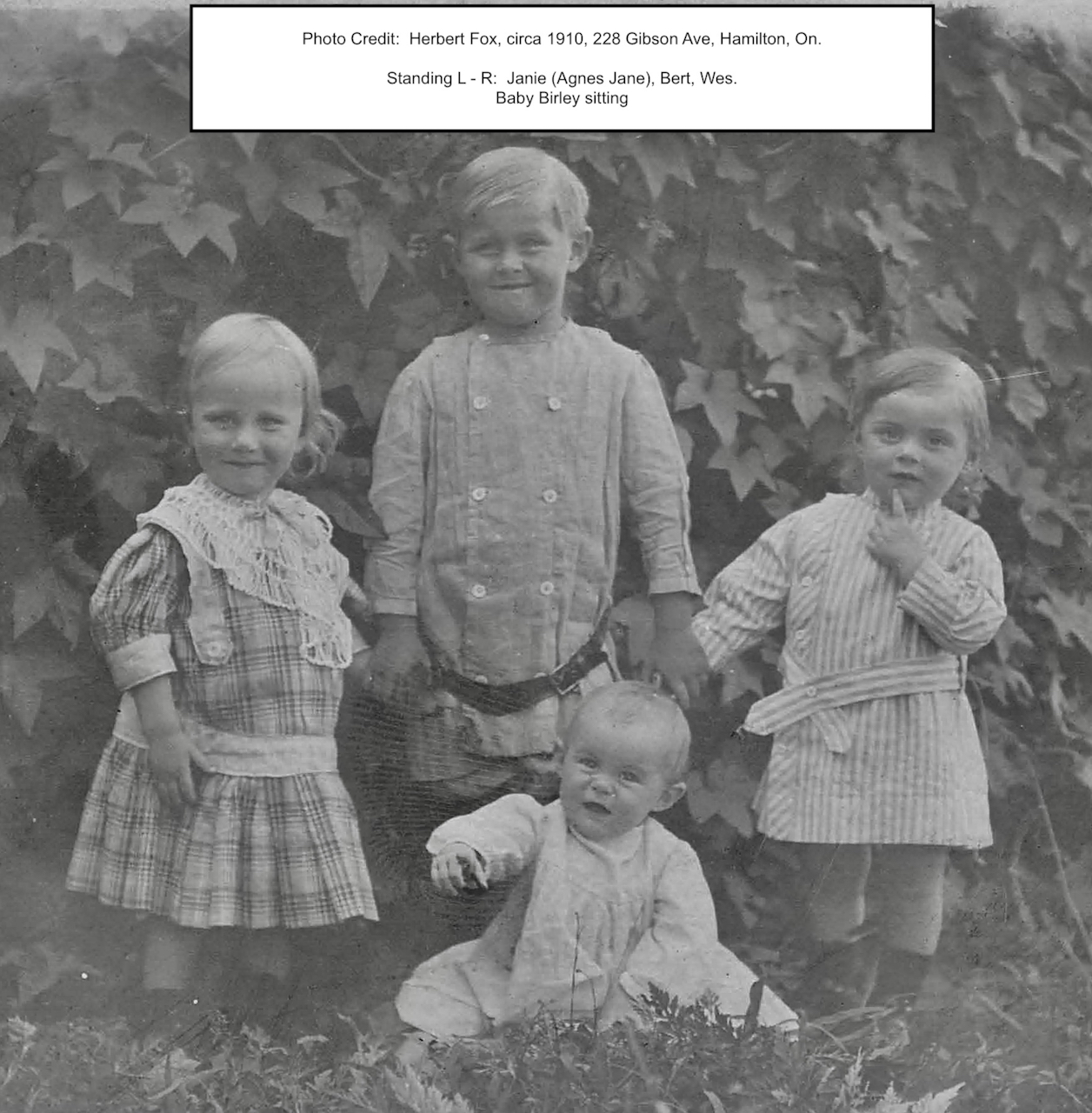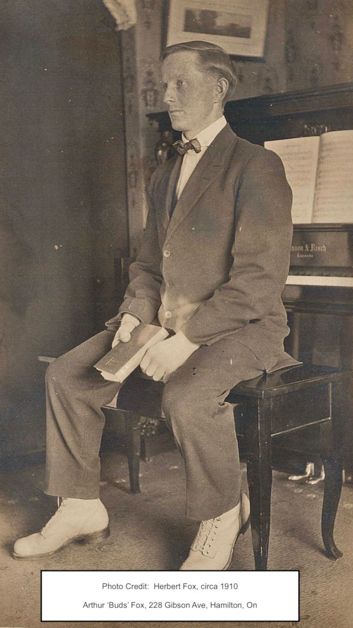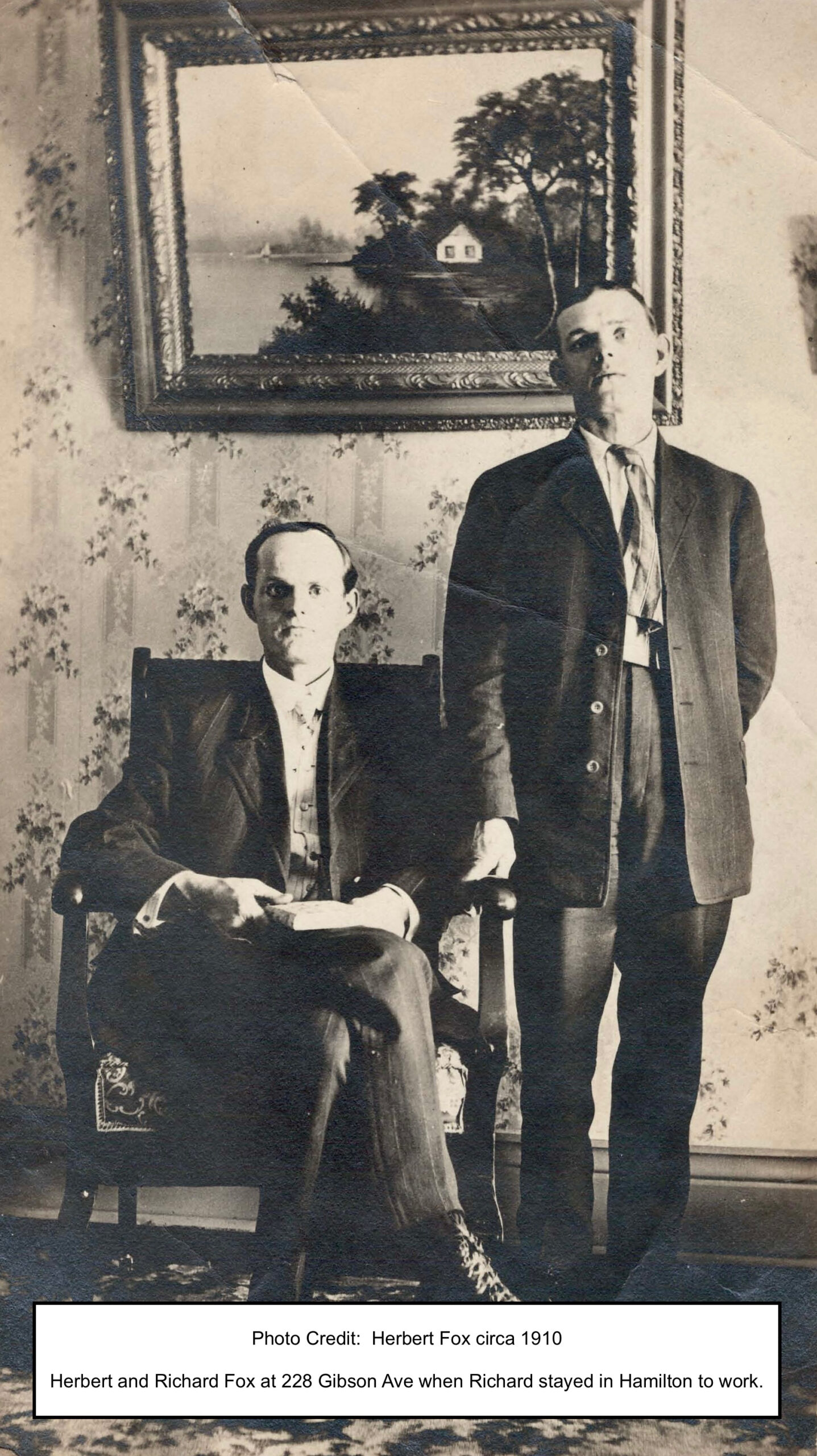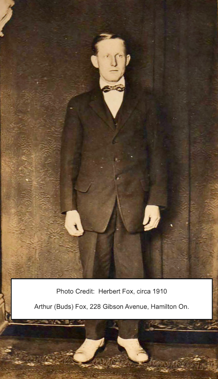 Life was not smooth sailing once the Fox family had settled. Baby Ethel Jane suffered convulsions and within eight months after immigrating, passed away in February 1888. Isaac Arthur lost two fingers in a work accident (encircled in above photo), and money must have been tight since in the 1891 census young Herbert is already at work as an office florist to help buoy living expenses. This early family photo coincides with the census: 1. proudly employed Herbert is standing tall at 13 years, Richard is 12 years, George is 8. Wilfred sitting on the stool is 6 years old and flanked by his parents who are both 37, holding two-year old Reginald and baby Arthur (Buds)1. Herbert Fox: 1891; Census Place: Ward 7, Hamilton City, Ontario, Canada; Roll: T-6342; Family No: 477