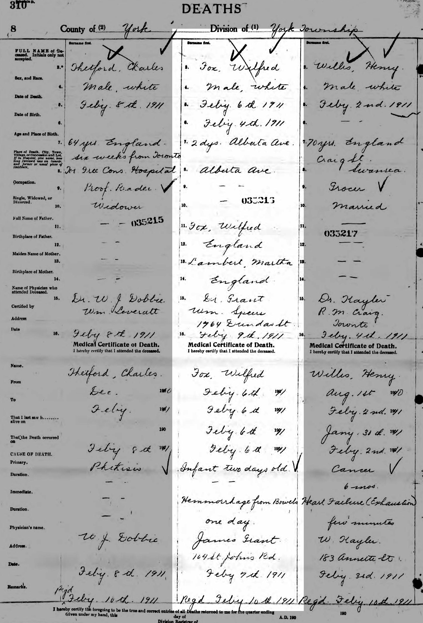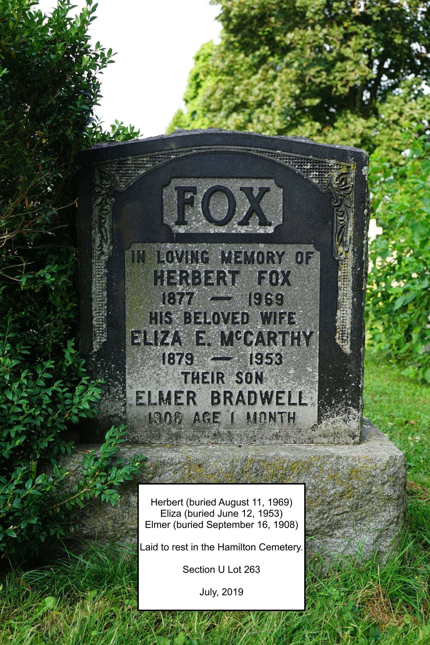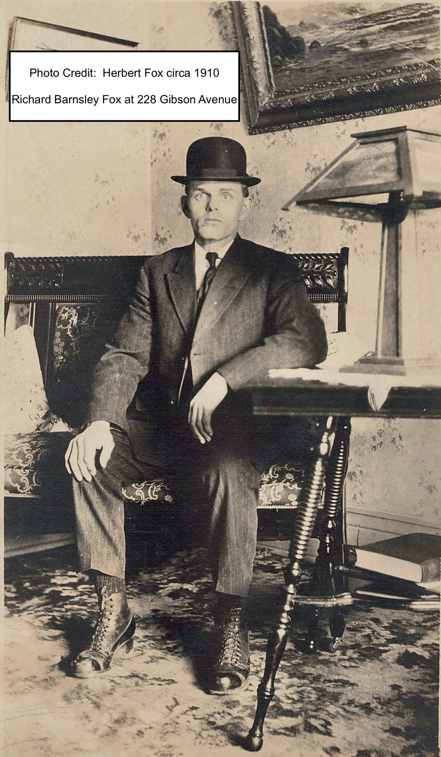 Life was not smooth sailing once the Fox family had settled. Baby Ethel Jane suffered convulsions and within eight months after immigrating, passed away in February 1888. Isaac Arthur lost two fingers in a work accident (encircled in above photo), and money must have been tight since in the 1891 census young Herbert is already at work as an office florist to help buoy living expenses. This early family photo coincides with the census: 1. proudly employed Herbert is standing tall at 13 years, Richard is 12 years, George is 8. Wilfred sitting on the stool is 6 years old and flanked by his parents who are both 37, holding two-year old Reginald and baby Arthur (Buds)1. Herbert Fox: 1891; Census Place: Ward 7, Hamilton City, Ontario, Canada; Roll: T-6342; Family No: 477