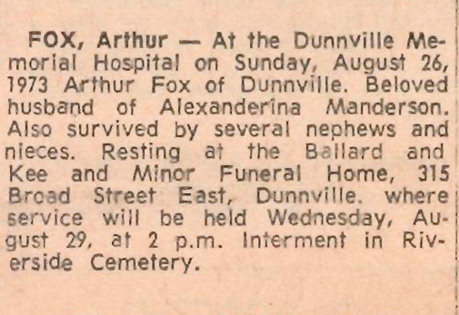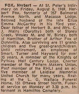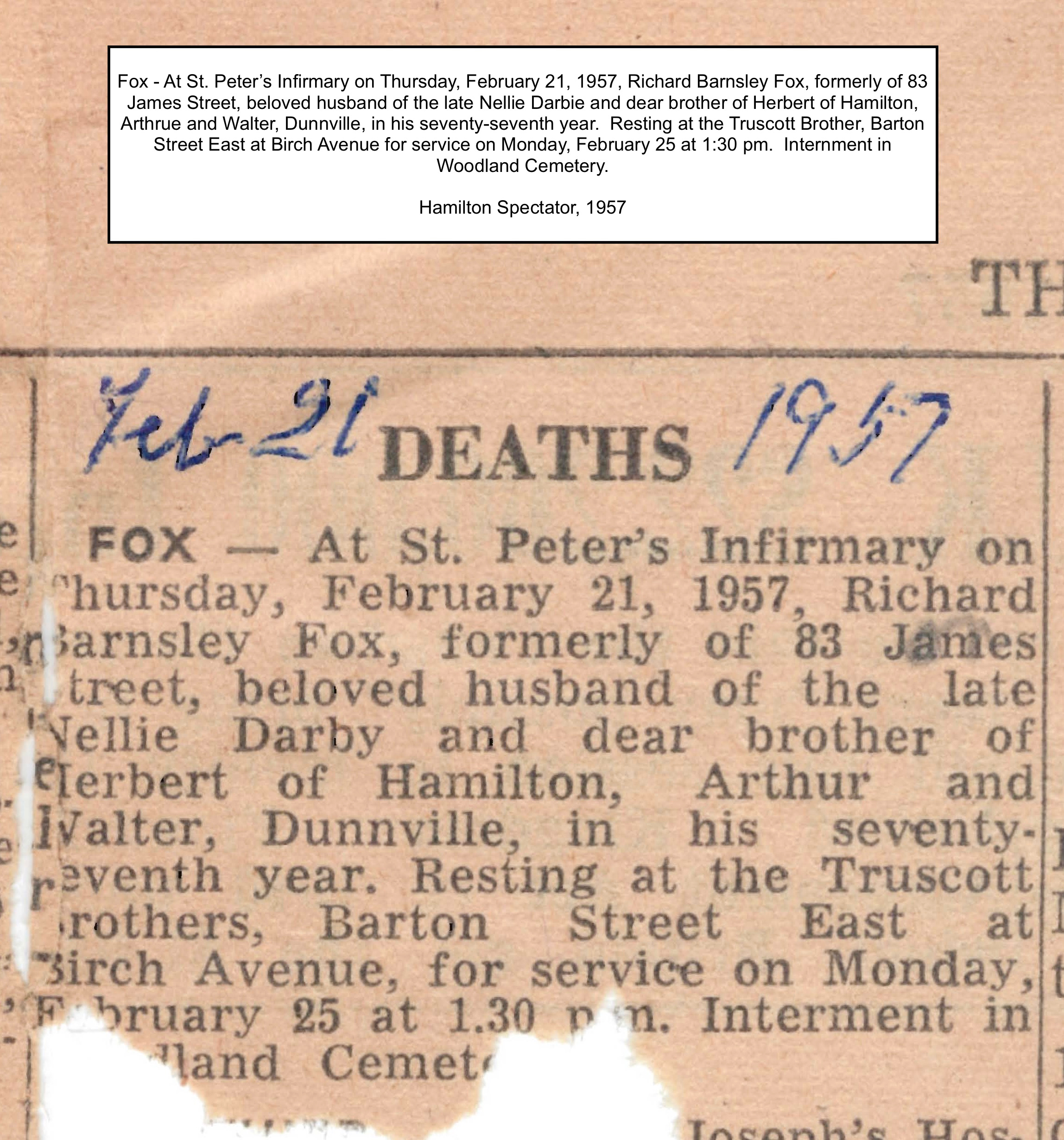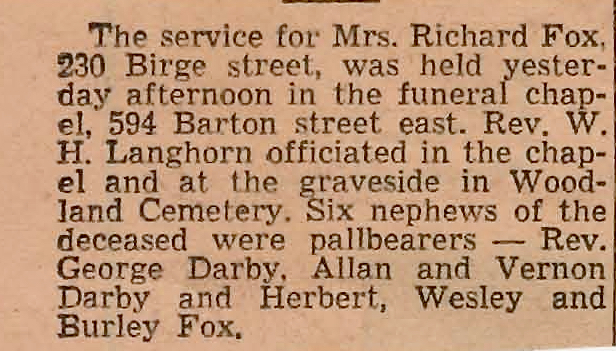 Following an illness of several years duration, the death occurred in the Haldimand War Memorial Hospital on Wednesday, January 4, 1961, of Walter Fox, in his 66 th year. Mr. Fox was born in Hamilton on January 1, 1896, a son of the late Isaac and Elizabeth (Barnsley) Fox, coming to Dunnville with his parents when he was eight years of age. He later moved to Moulton Township where he farmed until returning to Dunnville four years ago. Deceased was a member of Knox Presbyterian Church and of the Inman Road L.O.L. No. 171.