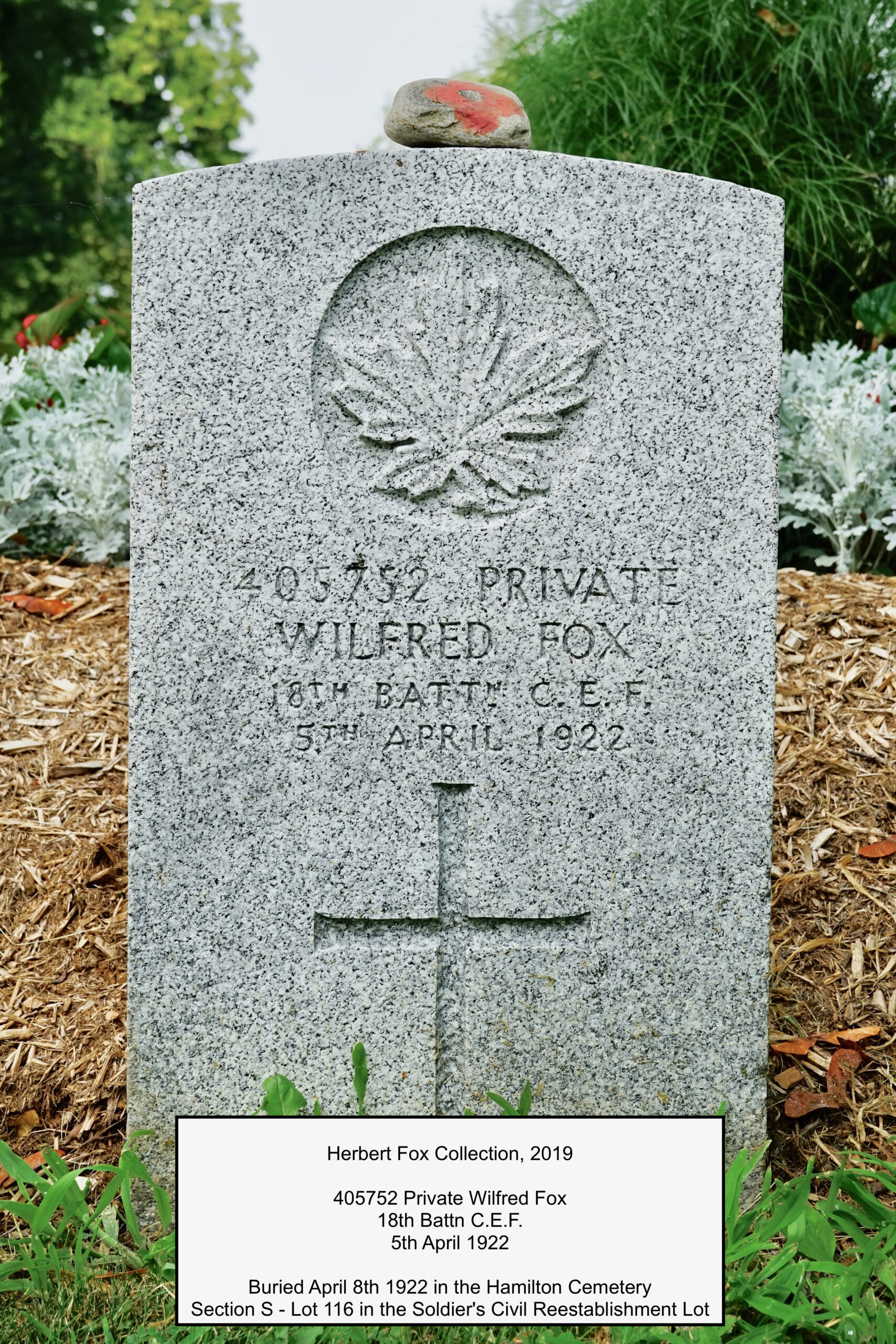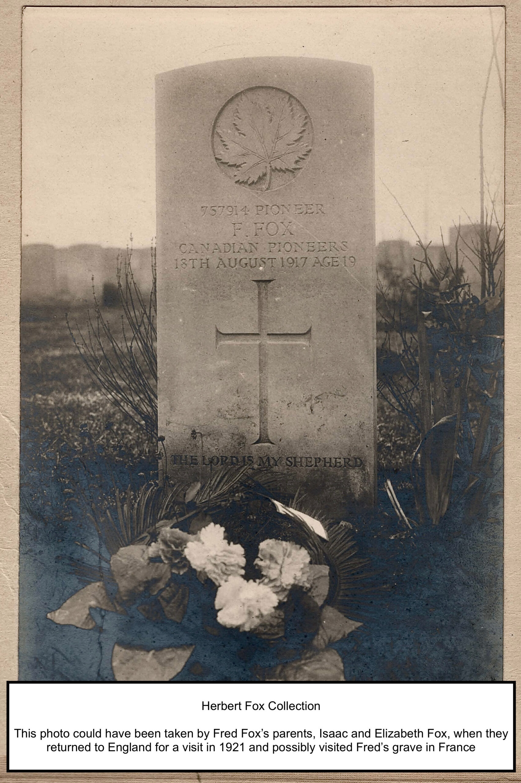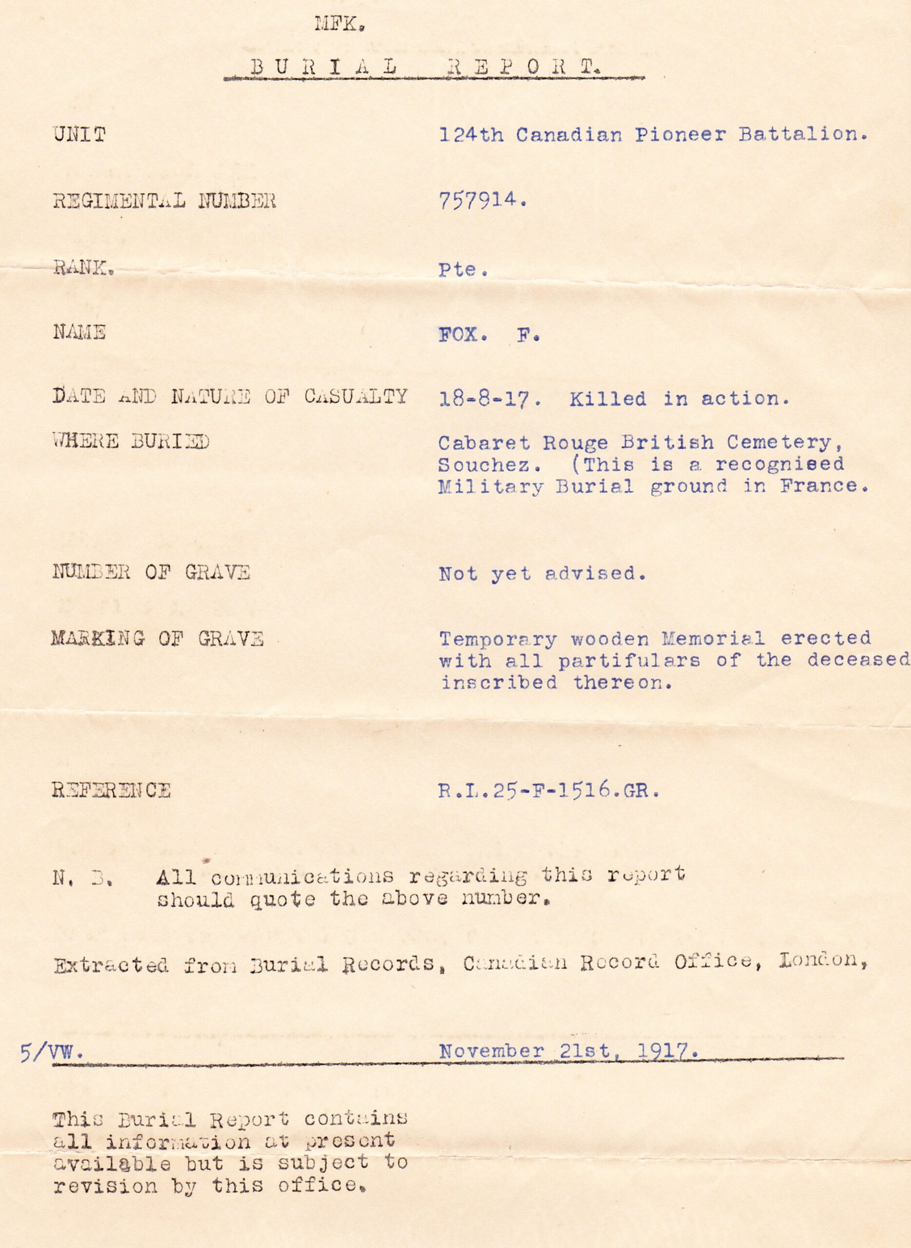 Fred FOX, Private, 124 th Battalion, Canadian Pioneers, died August 18, 1917, aged 19. Son of I.A. and Elizabeth Fox, Dunnville, Ontario. Service #757914
