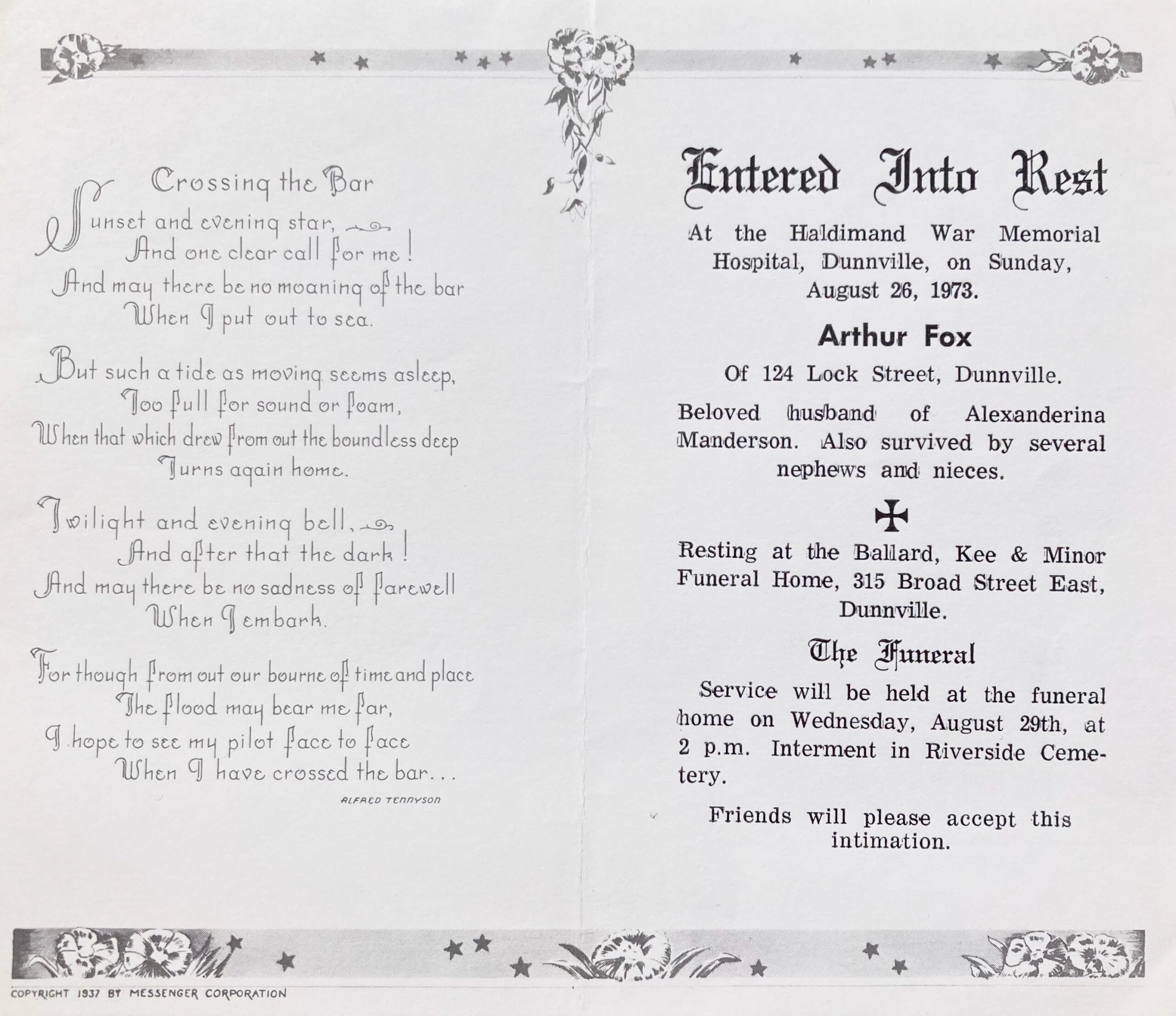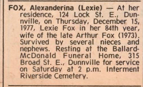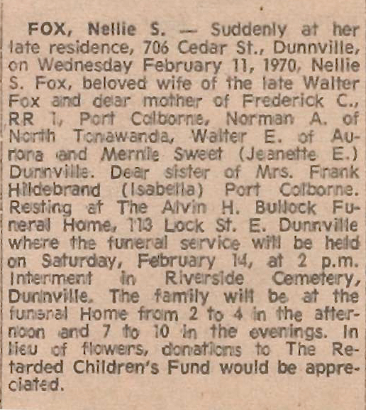 He was married in Dunnville on November 30, 1921, to Nellie Crichton, who survives him, together with three sons, Frederick of Dunnville, Norman A. of Tonawanda, N.Y., Walter E. of Aurora, Ontario; one daughter, Jeanette (Mrs. Mernie Sweet) of Dunnville; nine grandchildren and two brothers, Arthur of Moulton Township and Herbert of Hamilton. The funeral, which was very largely attended, was held from the Alvin H. Bullock Funeral Home, 111 Lock Street East, on Saturday afternoon, January 7 th , with Rev. E.C. McCullagh of Knox Presbyterian conducting the service. The floral tributes were numerous indeed, indicative of the esteem in which the deceased had been held. The pallbearers were Bert Fox, Burley Fox, Douglas Hildebrand, Elroy Riley, Home Riley and Bruce Riley. Interment was in Dunnville Riverside Cemetery.