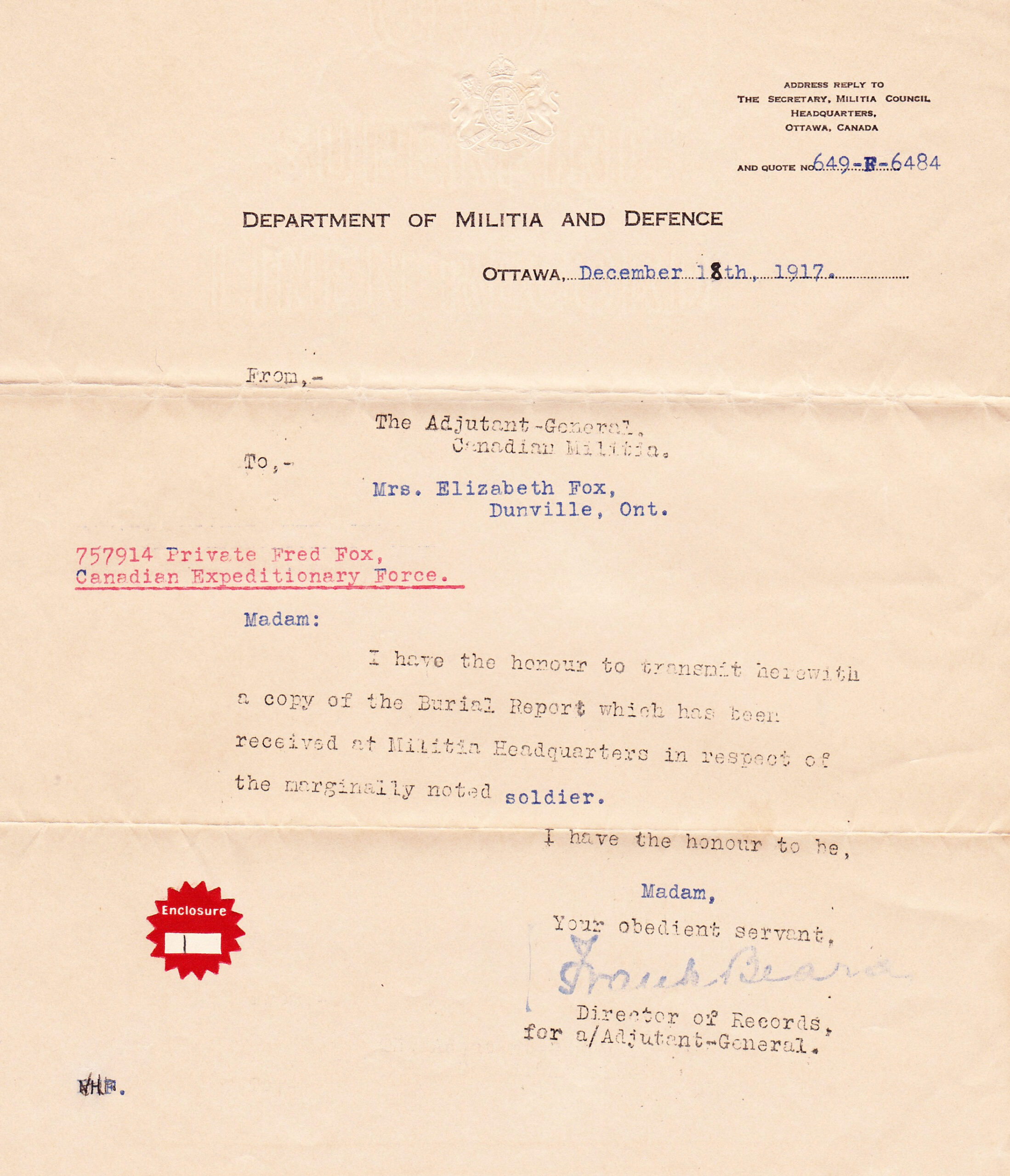 FEWER LOCAL SOLDIERS IN TODAY’S LIST – Pte. Frederick Fox Reported Killed in Battle – News has been received that Pte. Frederick Fox, a popular young resident of this city, was killed in action in the Lens fighting on August 18. The official word announcing his death came this week to his heartbroken parents, Mr. and Mrs. I.A. Fox, who now reside in Dunnville.