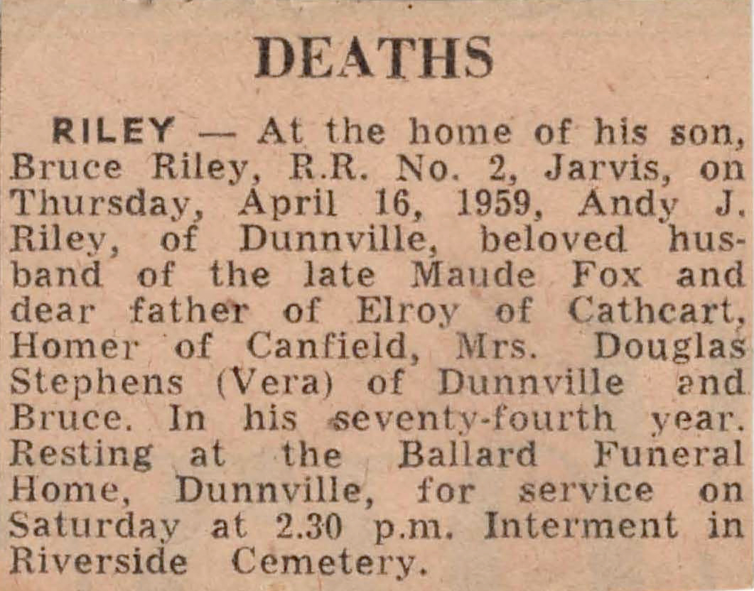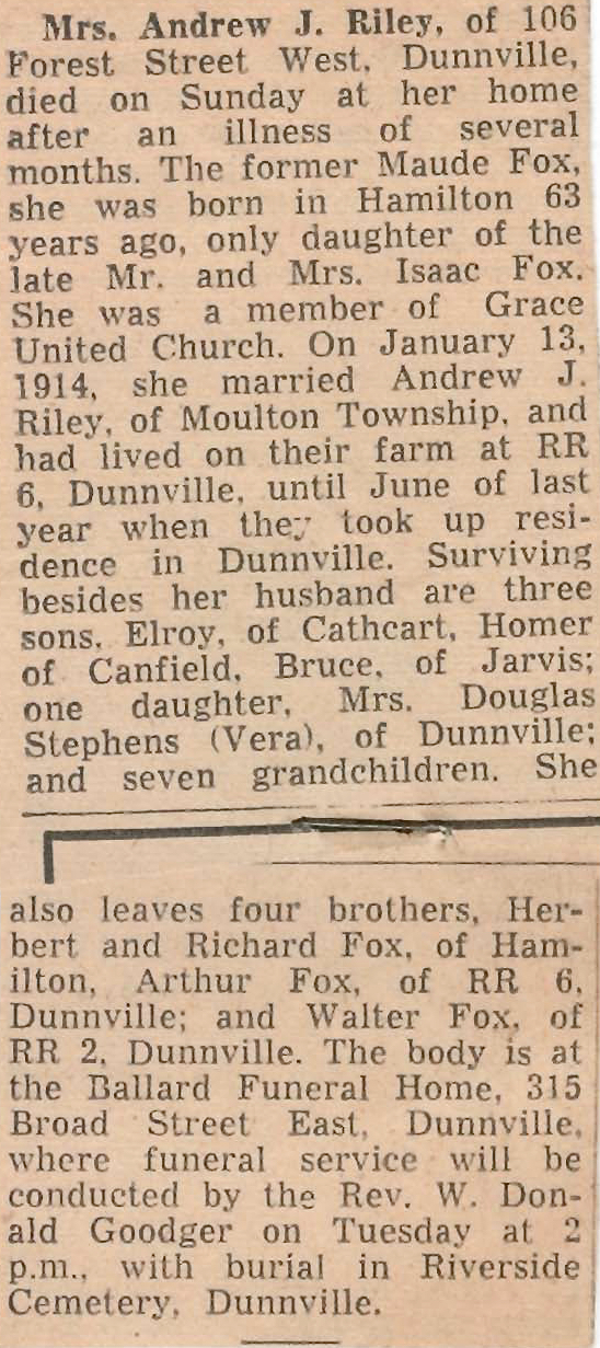 On Wednesday morning, January 13, 1915, a quiet wedding took place a the Methodist parsonage, Dunnville, when Rev. Dr. Laidman united in marriage Miss Maude Fox and Andy J. Riley, both popular young people of Moulton.